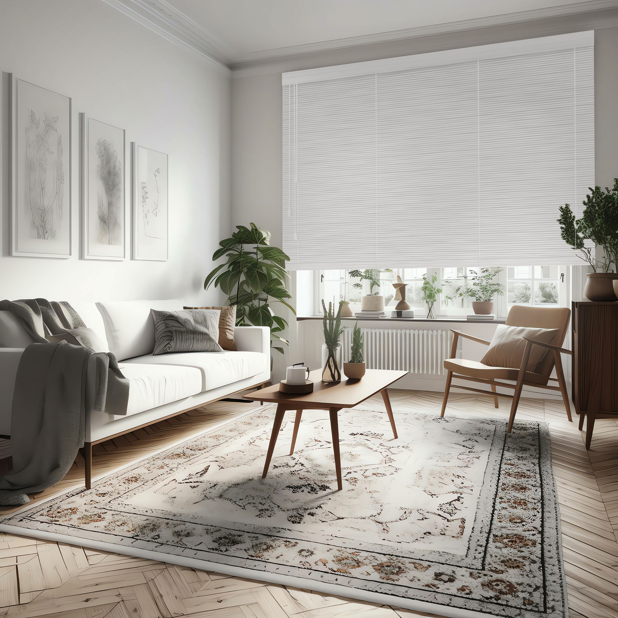 zaluzje drewniane biale z zaslonami w pokoju goscinnym