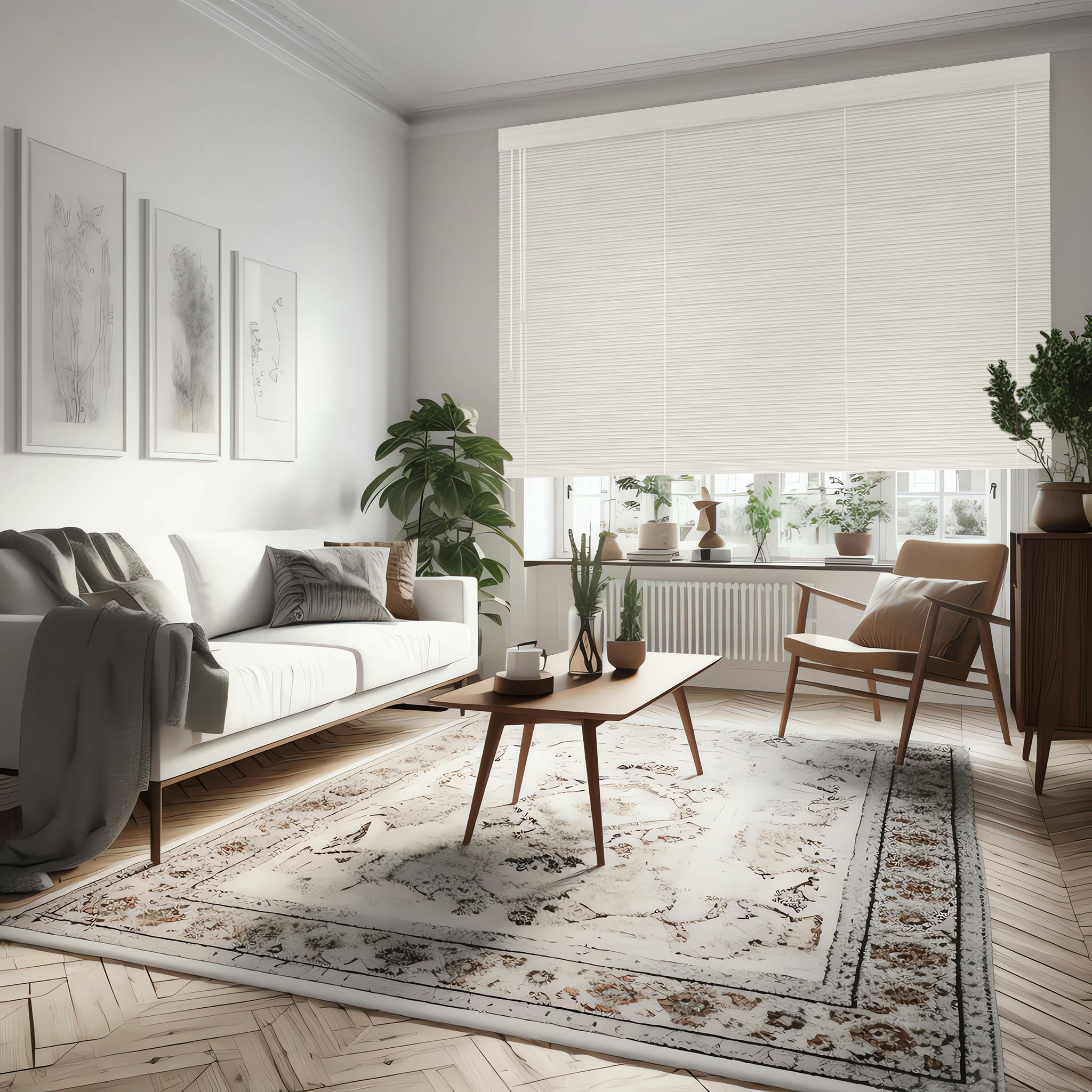 zaluzje drewniane biale z zaslonami w pokoju goscinnym